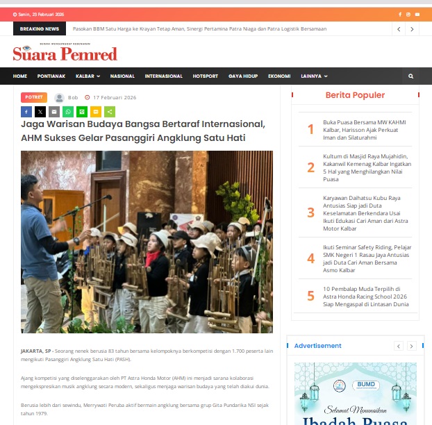 Jaga Warisan Budaya Bangsa Bertaraf Internasional, AHM Sukses Gelar Pasanggiri Angklung Satu Hati by masmul 17 Februari 2026 in Silahkan kunjungi https://www.suarapemredkalbar.com/read/potret/17022026/jaga-warisan-budaya-bangsa-bertaraf-internasional-ahm-sukses-gelar-pasanggiri-angklung-satu-hati. You Might Like Regional Public Launching New ADV160 The SUV Pride Grand Launching New PCX 160 Truly Exceptional! Tetap hati-hati ya bro sist berkendara saat hujan.