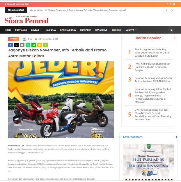 Jagonye Diskon November, Info Terbaik dari Promo Astra Motor Kalbar by masmul 20 November 2025 in Silahkan kunjungi https://www.suarapemredkalbar.com/read/potret/20112025/jagonye-diskon-november-info-terbaik-dari-promo-astra-motor-kalbar. You Might Like Regional Public Launching New ADV160 The SUV Pride Grand Launching New PCX 160 Truly Exceptional! Tetap hati-hati ya bro sist berkendara saat hujan.