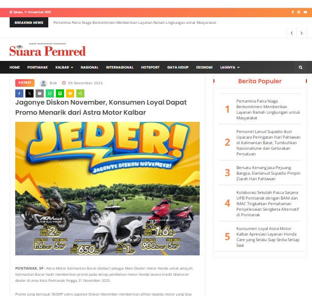 Jagonye Diskon November, Konsumen Loyal Dapat Promo Menarik dari Astra Motor Kalbar by masmul 9 November 2025 in Silahkan kunjungi https://www.suarapemredkalbar.com/read/potret/09112025/jagonye-diskon-november-konsumen-loyal-dapat-promo-menarik-dari-astra-motor-kalbar. You Might Like Regional Public Launching New ADV160 The SUV Pride Grand Launching New PCX 160 Truly Exceptional! Tetap hati-hati ya bro sist berkendara saat hujan.