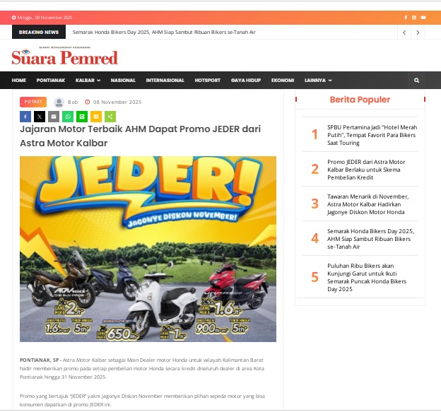 Jajaran Motor Terbaik AHM Dapat Promo JEDER dari Astra Motor Kalbar by masmul 8 November 2025 in Silahkan kunjungi https://www.suarapemredkalbar.com/read/potret/08112025/jajaran-motor-terbaik-ahm-dapat-promo-jeder-dari-astra-motor-kalbar. You Might Like Regional Public Launching New ADV160 The SUV Pride Grand Launching New PCX 160 Truly Exceptional! Tetap hati-hati ya bro sist berkendara saat hujan.