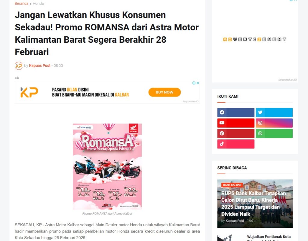 Jangan Lewatkan Khusus Konsumen Sekadau! Promo ROMANSA dari Astra Motor Kalimantan Barat Segera Berakhir 28 Februari by Muhammad Arif 22 Februari 2026 in Silahkan kunjungi https://www.kapuaspost.web.id/2026/02/jangan-lewatkan-khusus-konsumen-sekadau.html. Tags: astra Astra Motor kalbar Astra Motor Pontianak astramotor honda kalbar pontianak sepeda motor You Might Like Regional Public Launching New ADV160 The SUV Pride Grand Launching New PCX 160 Truly Exceptional! Tetap hati-hati ya bro sist berkendara saat hujan.