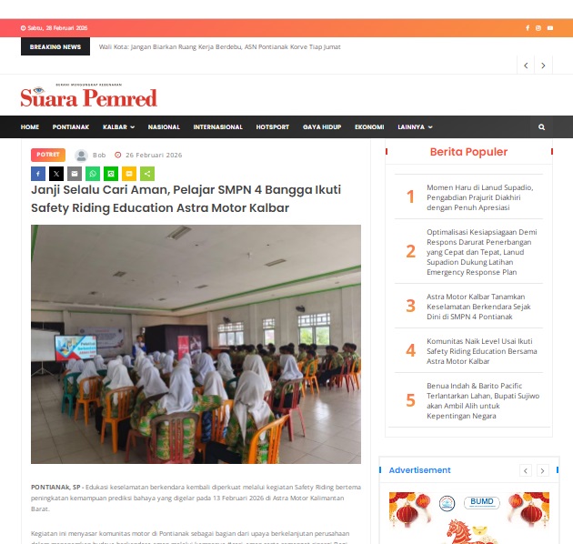 Janji Selalu Cari Aman, Pelajar SMPN 4 Bangga Ikuti Safety Riding Education Astra Motor Kalbar by masmul 26 Februari 2026 in Silahkan kunjungi https://www.suarapemredkalbar.com/read/potret/26022026/janji-selalu-cari-aman-pelajar-smpn-4-bangga-ikuti-safety-riding-education-astra-motor-kalbar. You Might Like Regional Public Launching New ADV160 The SUV Pride Grand Launching New PCX 160 Truly Exceptional! Tetap hati-hati ya bro sist berkendara saat hujan.