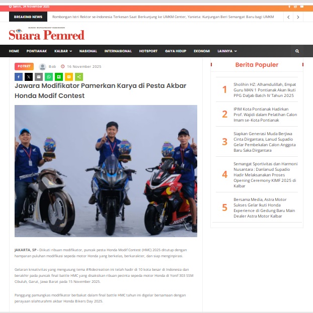 Jawara Modifikator Pamerkan Karya di Pesta Akbar Honda Modif Contest by masmul 16 November 2025 in Silahkan kunjungi https://www.suarapemredkalbar.com/read/potret/16112025/jawara-modifikator-pamerkan-karya-di-pesta-akbar-honda-modif-contest. You Might Like Regional Public Launching New ADV160 The SUV Pride Grand Launching New PCX 160 Truly Exceptional! Tetap hati-hati ya bro sist berkendara saat hujan.