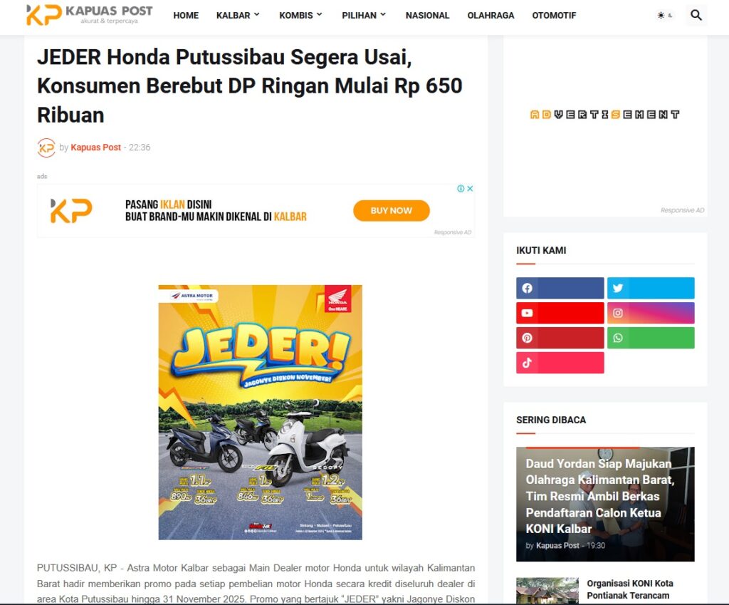 JEDER Honda Putussibau Segera Usai, Konsumen Berebut DP Ringan Mulai Rp 650 Ribuan by Muhammad Arif 27 November 2025 in Silahkan kunjungi https://www.kapuaspost.web.id/2025/11/jeder-honda-putussibau-segera-usai.html. Tags: astra Astra Motor kalbar Astra Motor Pontianak astramotor honda kalbar pontianak sepeda motor You Might Like Regional Public Launching New ADV160 The SUV Pride Grand Launching New PCX 160 Truly Exceptional! Tetap hati-hati ya bro sist berkendara saat hujan.