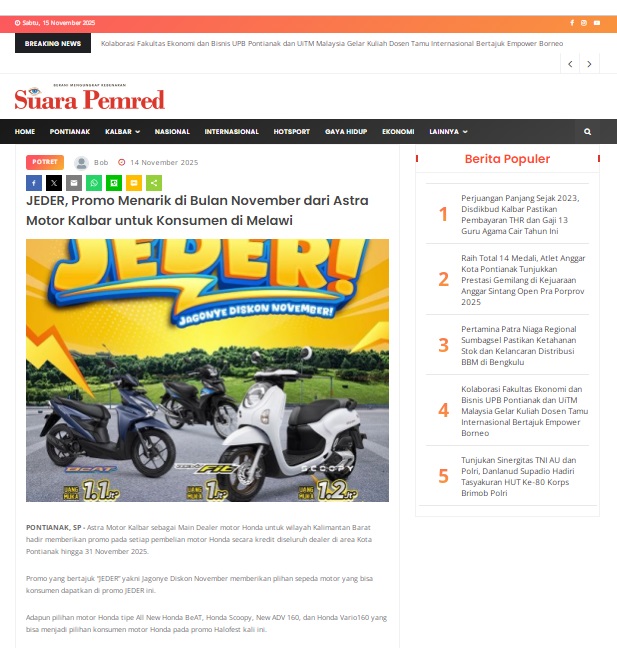 JEDER, Promo Menarik di Bulan November dari Astra Motor Kalbar untuk Konsumen di Melawi by masmul 14 November 2025 in Silahkan kunjungi https://www.suarapemredkalbar.com/read/potret/14112025/jeder-promo-menarik-di-bulan-november-dari-astra-motor-kalbar-untuk-konsumen-di-melawi. You Might Like Regional Public Launching New ADV160 The SUV Pride Grand Launching New PCX 160 Truly Exceptional! Tetap hati-hati ya bro sist berkendara saat hujan.