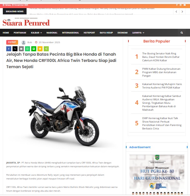 Jelajah Tanpa Batas Pecinta Big Bike Honda di Tanah Air, New Honda CRF1100L Africa Twin Terbaru Siap jadi Teman Sejati by masmul 20 November 2025 in Silahkan kunjungi https://www.suarapemredkalbar.com/read/potret/20112025/jelajah-tanpa-batas-pecinta-big-bike-honda-di-tanah-air-new-honda-crf1100l-africa-twin-terbaru-siap-jadi-teman-sejati. You Might Like Regional Public Launching New ADV160 The SUV Pride Grand Launching New PCX 160 Truly Exceptional! Tetap hati-hati ya bro sist berkendara saat hujan.