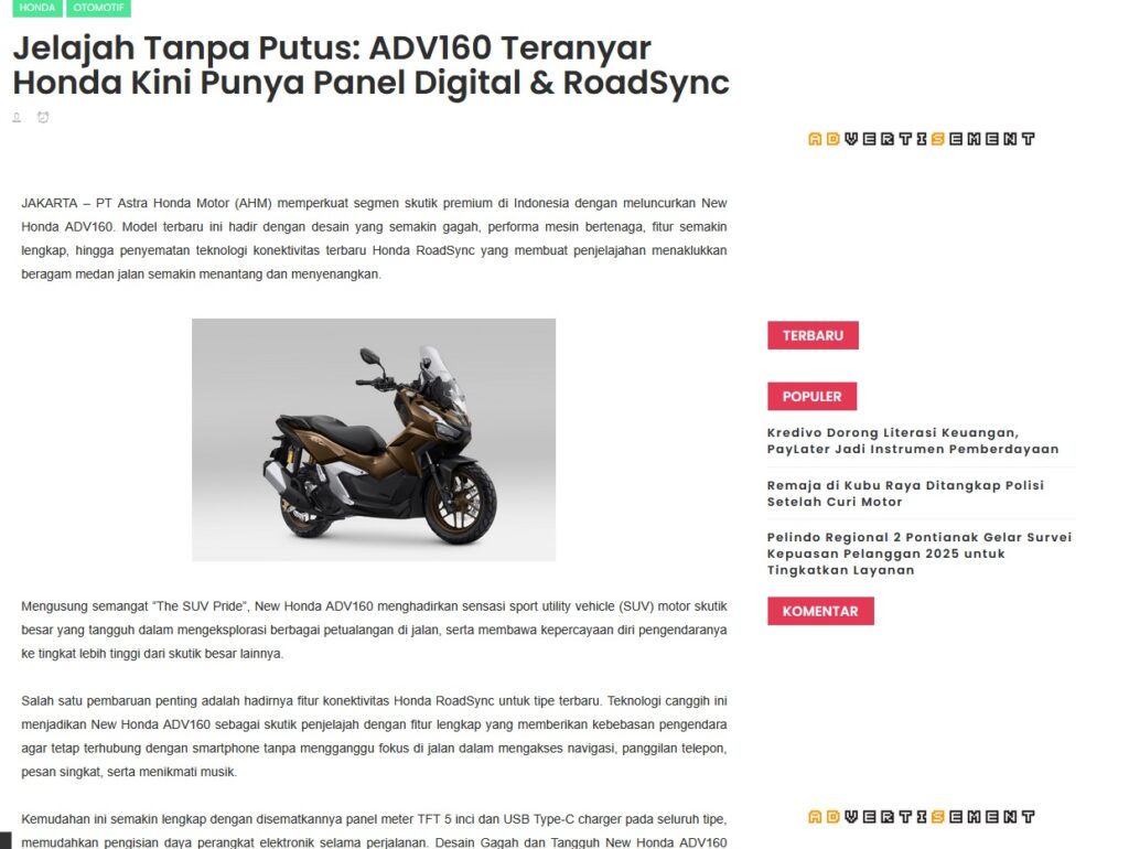 Jelajah Tanpa Putus: ADV160 Teranyar Honda Kini Punya Panel Digital & RoadSync by Muhammad Arif 8 September 2025 in Silahkan kunjungi https://www.kapuaspost.web.id/2025/09/jelajah-tanpa-putus-adv160-teranyar.html. Tags: astra Astra Motor kalbar Astra Motor Pontianak astramotor honda kalbar pontianak sepeda motor You Might Like Regional Public Launching New ADV160 The SUV Pride Grand Launching New PCX 160 Truly Exceptional! Tetap hati-hati ya bro sist berkendara saat hujan.