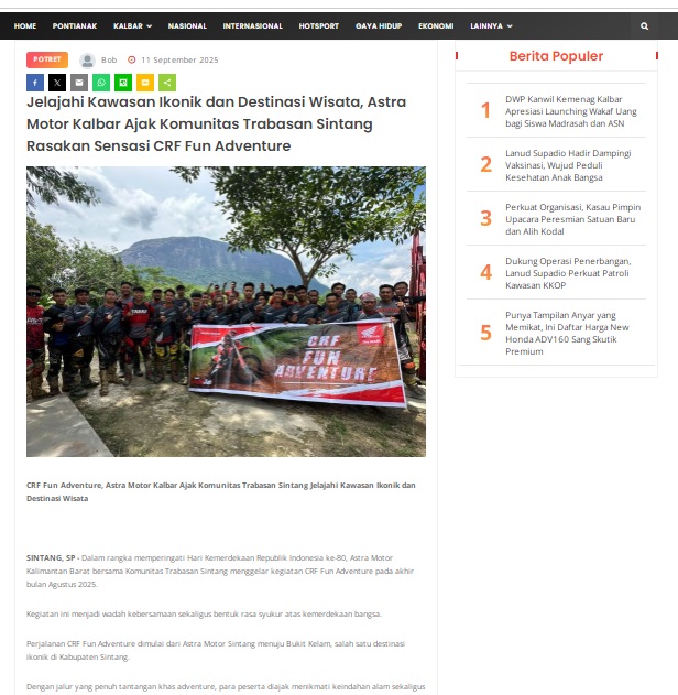 Jelajahi Kawasan Ikonik dan Destinasi Wisata, Astra Motor Kalbar Ajak Komunitas Trabasan Sintang Rasakan Sensasi CRF Fun Adventure by masmul 11 September 2025 in Silahkan kunjungi https://www.suarapemredkalbar.com/read/potret/11092025/jelajahi-kawasan-ikonik-dan-destinasi-wisata-astra-motor-kalbar-ajak-komunitas-trabasan-sintang-rasakan-sensasi-crf-fun-adventure. You Might Like Regional Public Launching New ADV160 The SUV Pride Grand Launching New PCX 160 Truly Exceptional! Tetap hati-hati ya bro sist berkendara saat hujan.