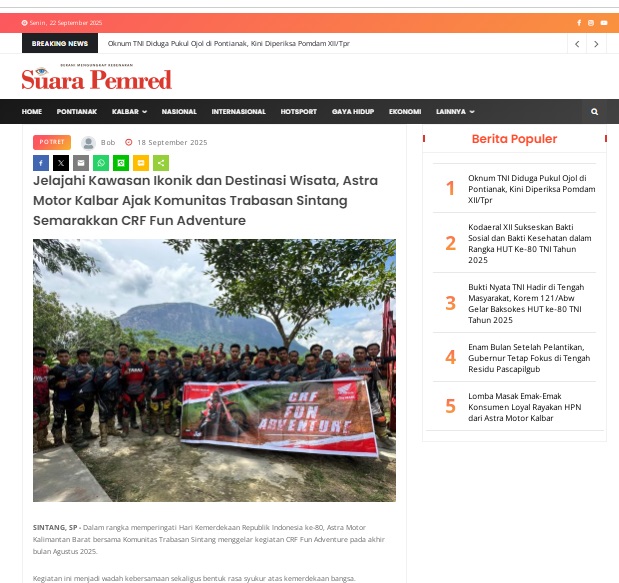Jelajahi Kawasan Ikonik dan Destinasi Wisata, Astra Motor Kalbar Ajak Komunitas Trabasan Sintang Semarakkan CRF Fun Adventure by masmul 18 September 2025 in Silahkan kunjungi https://www.suarapemredkalbar.com/read/potret/18092025/jelajahi-kawasan-ikonik-dan-destinasi-wisata-astra-motor-kalbar-ajak-komunitas-trabasan-sintang-semarakkan-crf-fun-adventure-1. You Might Like Regional Public Launching New ADV160 The SUV Pride Grand Launching New PCX 160 Truly Exceptional! Tetap hati-hati ya bro sist berkendara saat hujan.