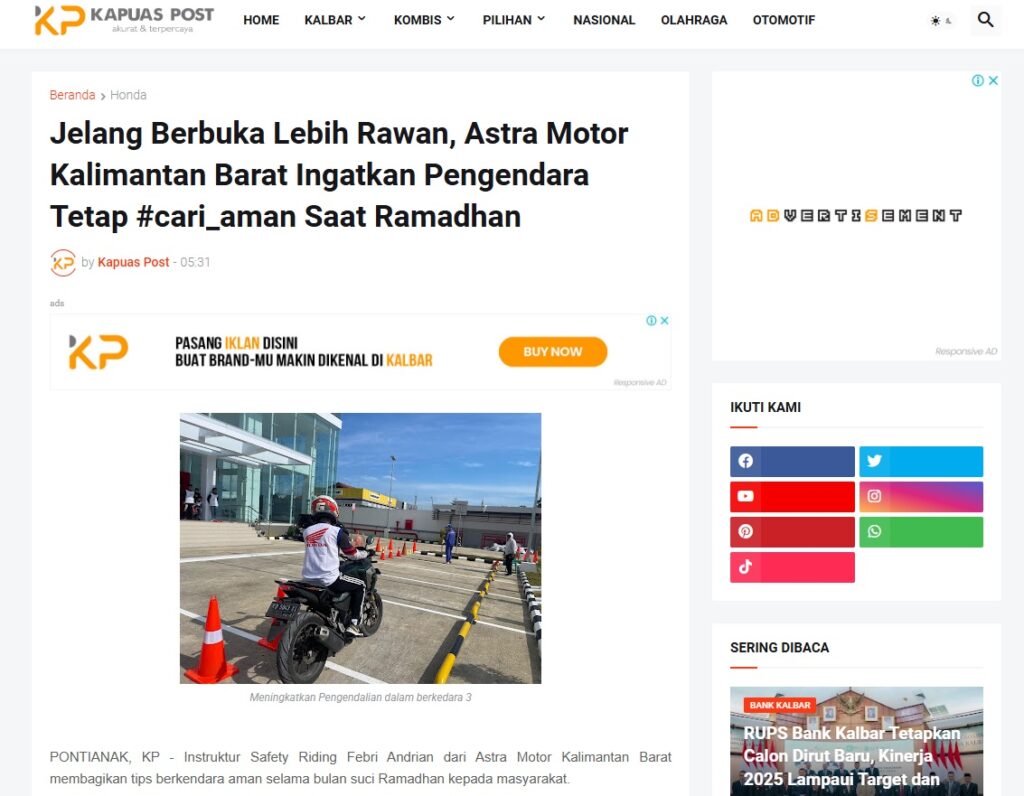 Jelang Berbuka Lebih Rawan, Astra Motor Kalimantan Barat Ingatkan Pengendara Tetap #cari_aman Saat Ramadhan by Muhammad Arif 26 Februari 2026 in Silahkan kunjungi https://www.kapuaspost.web.id/2026/02/jelang-berbuka-lebih-rawan-astra-motor.html. Tags: astra Astra Motor kalbar Astra Motor Pontianak astramotor honda kalbar pontianak sepeda motor You Might Like Regional Public Launching New ADV160 The SUV Pride Grand Launching New PCX 160 Truly Exceptional! Tetap hati-hati ya bro sist berkendara saat hujan.