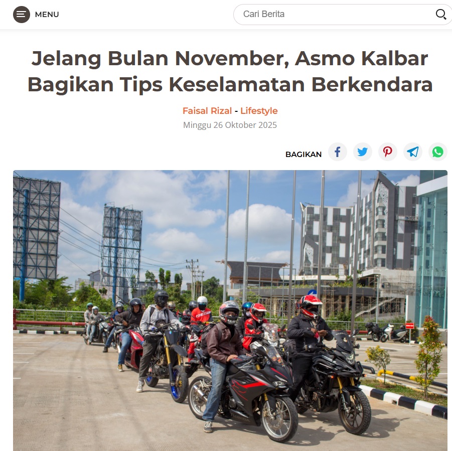 Jelang Bulan November, Asmo Kalbar Bagikan Tips Keselamatan Berkendara by Dodi Dodi 26 Oktober 2025 in Silahkan kunjungi https://harianberkat.com/2025/10/26/jelang-bulan-november-asmo-kalbar-bagikan-tips-keselamatan-berkendara/. You Might Like Regional Public Launching New ADV160 The SUV Pride Grand Launching New PCX 160 Truly Exceptional! Tetap hati-hati ya bro sist berkendara saat hujan.