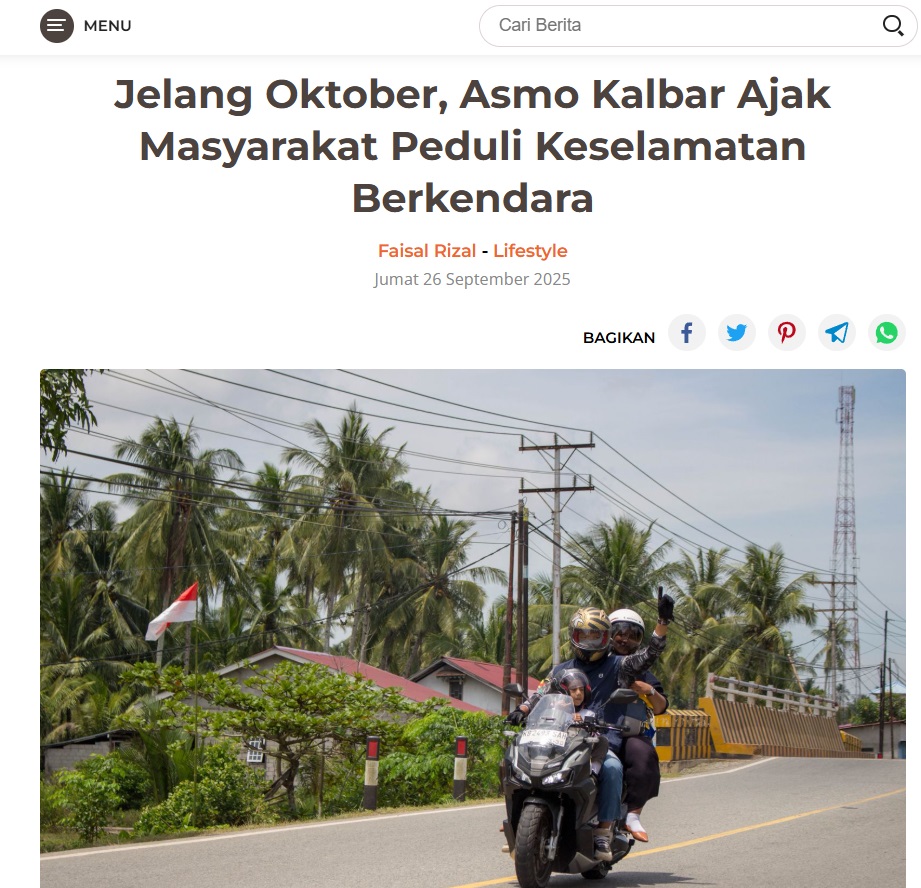 Jelang Oktober, Asmo Kalbar Ajak Masyarakat Peduli Keselamatan Berkendara by Dodi Dodi 26 September 2025 in Silahkan kunjungi https://harianberkat.com/2025/09/26/jelang-oktober-asmo-kalbar-ajak-masyarakat-peduli-keselamatan-berkendara/. You Might Like Regional Public Launching New ADV160 The SUV Pride Grand Launching New PCX 160 Truly Exceptional! Tetap hati-hati ya bro sist berkendara saat hujan.