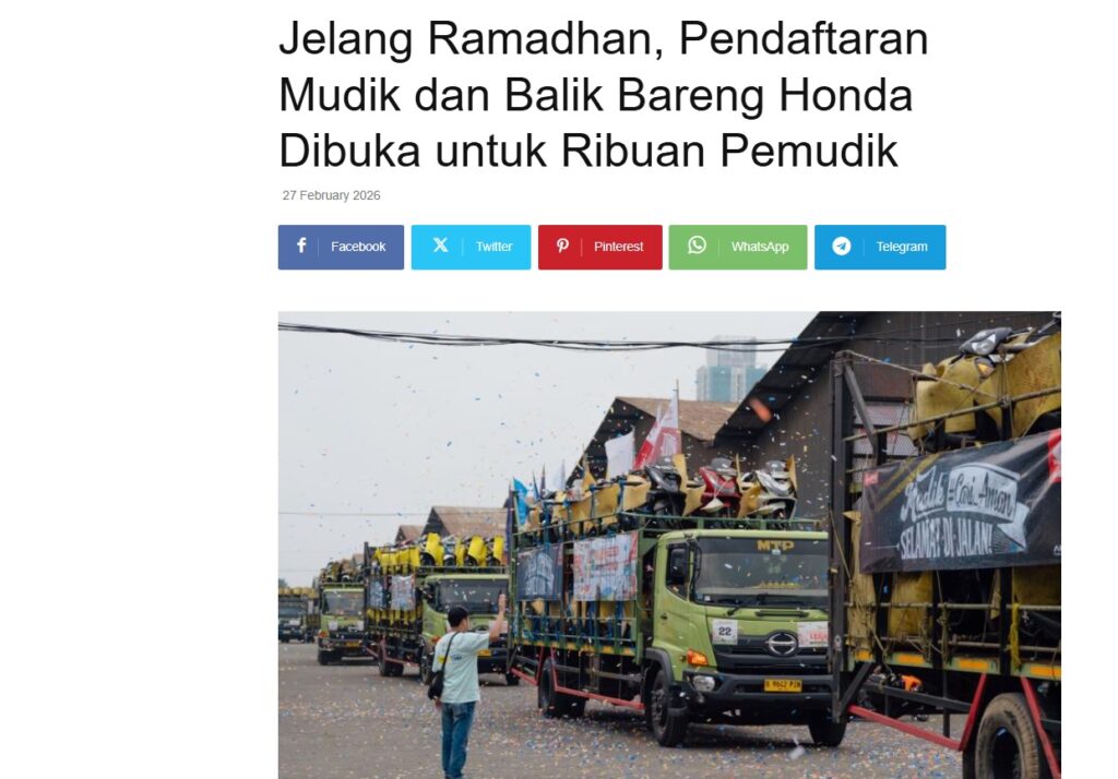 Jelang Ramadhan, Pendaftaran Mudik dan Balik Bareng Honda Dibuka untuk Ribuan Pemudik by Nova Sari 27 Februari 2026 in Silahkan kunjungi https://equator.co.id/jelang-ramadhan-pendaftaran-mudik-dan-balik-bareng-honda-dibuka-untuk-ribuan-pemudik/. You Might Like Regional Public Launching New ADV160 The SUV Pride Grand Launching New PCX 160 Truly Exceptional! Tetap hati-hati ya bro sist berkendara saat hujan.