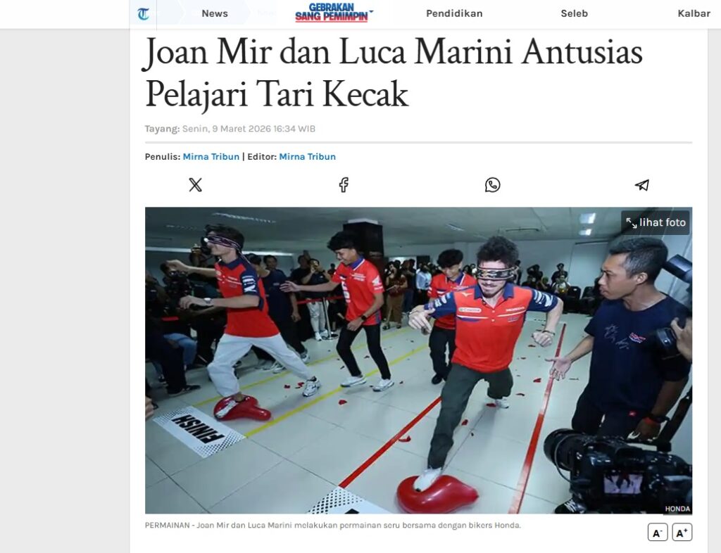 Joan Mir dan Luca Marini Antusias Pelajari Tari Kecak by Nina Soraya 9 Maret 2026 in Silahkan kunjungi https://pontianak.tribunnews.com/otomotif/1165215/joan-mir-dan-luca-marini-antusias-pelajari-tari-kecak. You Might Like Regional Public Launching New ADV160 The SUV Pride Grand Launching New PCX 160 Truly Exceptional! Tetap hati-hati ya bro sist berkendara saat hujan.