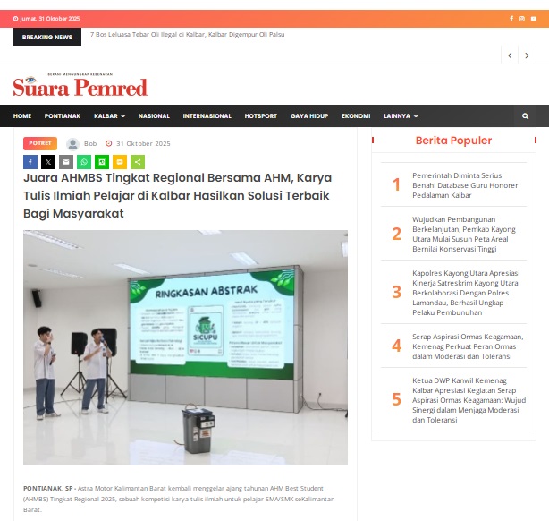 Juara AHMBS Tingkat Regional Bersama AHM, Karya Tulis Ilmiah Pelajar di Kalbar Hasilkan Solusi Terbaik Bagi Masyarakat by masmul 31 Oktober 2025 in Silahkan kunjungi https://www.suarapemredkalbar.com/read/potret/31102025/juara-ahmbs-tingkat-regional-bersama-ahm-karya-tulis-ilmiah-pelajar-di-kalbar-hasilkan-solusi-terbaik-bagi-masyarakat. You Might Like Regional Public Launching New ADV160 The SUV Pride Grand Launching New PCX 160 Truly Exceptional! Tetap hati-hati ya bro sist berkendara saat hujan.