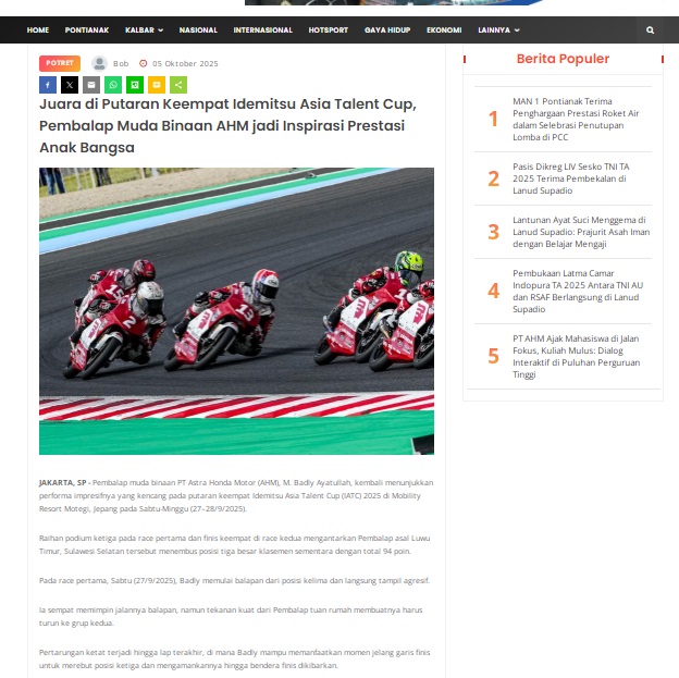 Juara di Putaran Keempat Idemitsu Asia Talent Cup, Pembalap Muda Binaan AHM jadi Inspirasi Prestasi Anak Bangsa by masmul 5 Oktober 2025 in Silahkan kunjungi https://www.suarapemredkalbar.com/read/potret/05102025/juara-di-putaran-keempat-idemitsu-asia-talent-cup-pembalap-muda-binaan-ahm-jadi-inspirasi-prestasi-anak-bangsa. You Might Like Regional Public Launching New ADV160 The SUV Pride Grand Launching New PCX 160 Truly Exceptional! Tetap hati-hati ya bro sist berkendara saat hujan.
