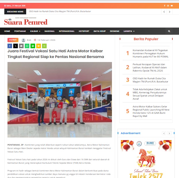 Juara Festival Vokasi Satu Hati Astra Motor Kalbar Tingkat Regional Siap ke Pentas Nasional Bersama by masmul 14 Februari 2026 in Silahkan kunjungi https://www.suarapemredkalbar.com/read/potret/14022026/juara-festival-vokasi-satu-hati-astra-motor-kalbar-tingkat-regional-siap-ke-pentas-nasional-bersama. You Might Like Regional Public Launching New ADV160 The SUV Pride Grand Launching New PCX 160 Truly Exceptional! Tetap hati-hati ya bro sist berkendara saat hujan.