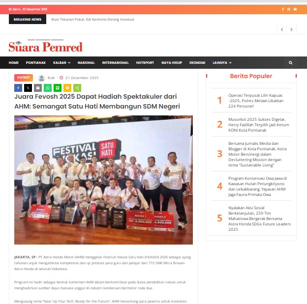Juara Fevosh 2025 Dapat Hadiah Spektakuler dari AHM: Semangat Satu Hati Membangun SDM Negeri by masmul 21 Desember 2025 in Silahkan kunjungi https://www.suarapemredkalbar.com/read/potret/21122025/juara-fevosh-2025-dapat-hadiah-spektakuler-dari-ahm-semangat-satu-hati-membangun-sdm-negeri. You Might Like Regional Public Launching New ADV160 The SUV Pride Grand Launching New PCX 160 Truly Exceptional! Tetap hati-hati ya bro sist berkendara saat hujan.