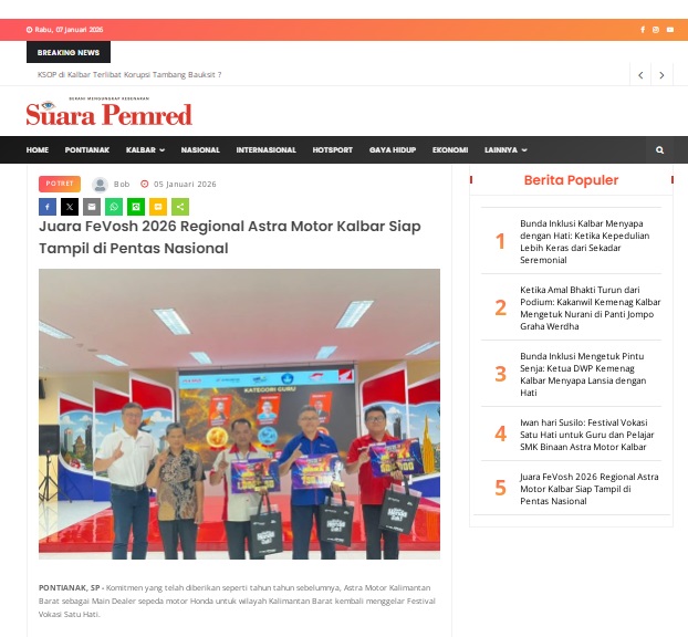 Juara FeVosh 2026 Regional Astra Motor Kalbar Siap Tampil di Pentas Nasional by masmul 5 Januari 2026 in Silahkan kunjungi https://www.suarapemredkalbar.com/read/potret/05012026/juara-fevosh-2026-regional-astra-motor-kalbar-siap-tampil-di-pentas-nasional. You Might Like Regional Public Launching New ADV160 The SUV Pride Grand Launching New PCX 160 Truly Exceptional! Tetap hati-hati ya bro sist berkendara saat hujan.