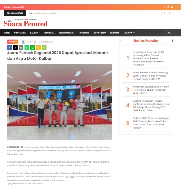 Juara FeVosh Regional 2026 Dapat Apresiasi Menarik dari Astra Motor Kalbar by masmul 11 Januari 2026 in Silahkan kunjungi https://www.suarapemredkalbar.com/read/potret/11012026/juara-fevosh-regional-2026-dapat-apresiasi-menarik-dari-astra-motor-kalbar. You Might Like Regional Public Launching New ADV160 The SUV Pride Grand Launching New PCX 160 Truly Exceptional! Tetap hati-hati ya bro sist berkendara saat hujan.