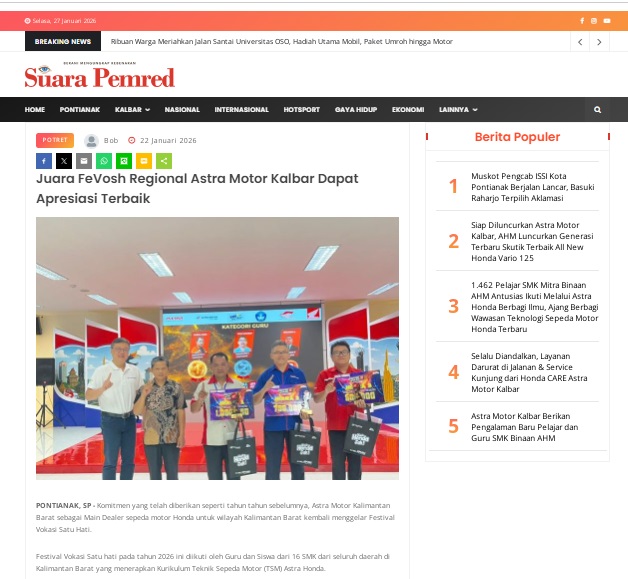 Juara FeVosh Regional Astra Motor Kalbar Dapat Apresiasi Terbaik by masmul 22 Januari 2026 in Silahkan kunjungi https://www.suarapemredkalbar.com/read/potret/22012026/juara-fevosh-regional-astra-motor-kalbar-dapat-apresiasi-terbaik. You Might Like Regional Public Launching New ADV160 The SUV Pride Grand Launching New PCX 160 Truly Exceptional! Tetap hati-hati ya bro sist berkendara saat hujan.