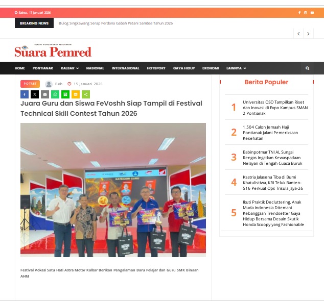 Juara Guru dan Siswa FeVoshh Siap Tampil di Festival Technical Skill Contest Tahun 2026 by masmul 15 Januari 2026 in Silahkan kunjungi https://www.suarapemredkalbar.com/read/potret/15012026/juara-guru-dan-siswa-fevoshh-siap-tampil-di-festival-technical-skill-contest-tahun-2026. You Might Like Regional Public Launching New ADV160 The SUV Pride Grand Launching New PCX 160 Truly Exceptional! Tetap hati-hati ya bro sist berkendara saat hujan.