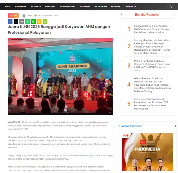Juara KLHN 2025 Bangga jadi Karyawan AHM dengan Profesional Pelayanan by masmul 6 September 2025 in Silahkan kunjungi https://www.suarapemredkalbar.com/read/potret/06092025/juara-klhn-2025-bangga-jadi-karyawan-ahm-dengan-profesional-pelayanan. You Might Like Regional Public Launching New ADV160 The SUV Pride Grand Launching New PCX 160 Truly Exceptional! Tetap hati-hati ya bro sist berkendara saat hujan.