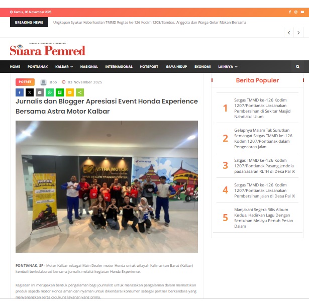 Jurnalis dan Blogger Apresiasi Event Honda Experience Bersama Astra Motor Kalbar by masmul 3 November 2025 in Silahkan kunjungi https://www.suarapemredkalbar.com/read/potret/03112025/jurnalis-dan-blogger-apresiasi-event-honda-experience-bersama-astra-motor-kalbar. You Might Like Regional Public Launching New ADV160 The SUV Pride Grand Launching New PCX 160 Truly Exceptional! Tetap hati-hati ya bro sist berkendara saat hujan.