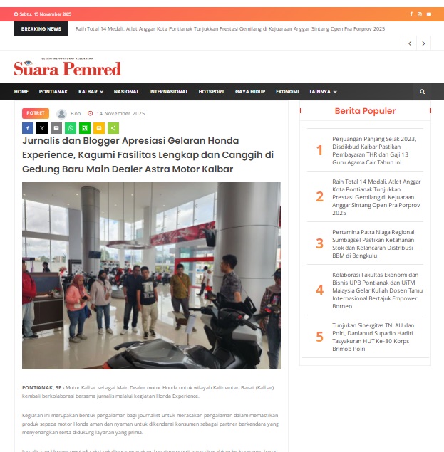 Jurnalis dan Blogger Apresiasi Gelaran Honda Experience, Kagumi Fasilitas Lengkap dan Canggih di Gedung Baru Main Dealer Astra Motor Kalbar by masmul 14 November 2025 in Silahkan kunjungi https://www.suarapemredkalbar.com/read/potret/14112025/jurnalis-dan-blogger-apresiasi-gelaran-honda-experience-kagumi-fasilitas-lengkap-dan-canggih-di-gedung-baru-main-dealer-astra-motor-kalbar. You Might Like Regional Public Launching New ADV160 The SUV Pride Grand Launching New PCX 160 Truly Exceptional! Tetap hati-hati ya bro sist berkendara saat hujan.