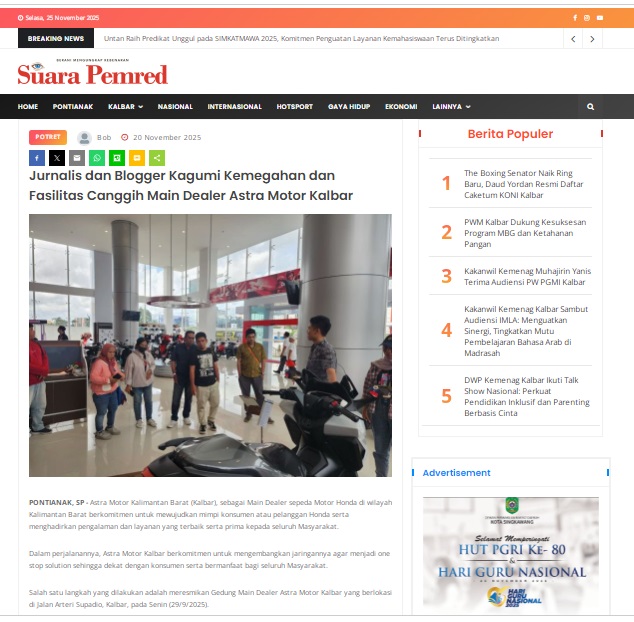 Jurnalis dan Blogger Kagumi Kemegahan dan Fasilitas Canggih Main Dealer Astra Motor Kalbar by masmul 20 November 2025 in Silahkan kunjungi https://www.suarapemredkalbar.com/read/potret/20112025/jurnalis-dan-blogger-kagumi-kemegahan-dan-fasilitas-canggih-main-dealer-astra-motor-kalbar. You Might Like Regional Public Launching New ADV160 The SUV Pride Grand Launching New PCX 160 Truly Exceptional! Tetap hati-hati ya bro sist berkendara saat hujan.