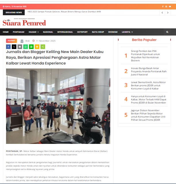 Jurnalis dan Blogger Keliling New Main Dealer Kubu Raya, Berikan Apresiasi Penghargaan Astra Motor Kalbar Lewat Honda Experience by masmul 11 November 2025 in Silahkan kunjungi https://www.suarapemredkalbar.com/read/potret/11112025/jurnalis-dan-blogger-keliling-new-main-dealer-kubu-raya-berikan-apresiasi-penghargaan-astra-motor-kalbar-lewat-honda-experience. You Might Like Regional Public Launching New ADV160 The SUV Pride Grand Launching New PCX 160 Truly Exceptional! Tetap hati-hati ya bro sist berkendara saat hujan.