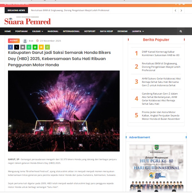 Kabupaten Garut jadi Saksi Semarak Honda Bikers Day (HBD) 2025, Kebersamaan Satu Hati Ribuan Penggunan Motor Honda by masmul 23 November 2025 in Silahkan kunjungi https://www.suarapemredkalbar.com/read/potret/23112025/kabupaten-garut-jadi-saksi-semarak-honda-bikers-day-hbd-2025-kebersamaan-satu-hati-ribuan-penggunan-motor-honda. You Might Like Regional Public Launching New ADV160 The SUV Pride Grand Launching New PCX 160 Truly Exceptional! Tetap hati-hati ya bro sist berkendara saat hujan.