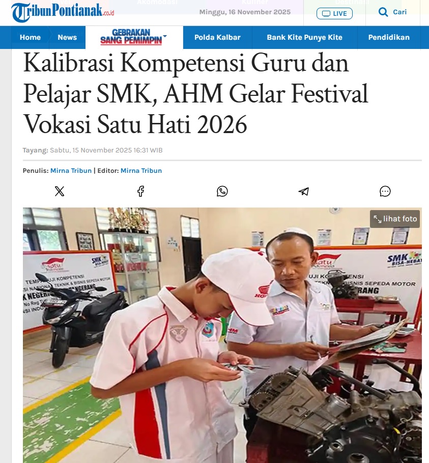 Kalibrasi Kompetensi Guru dan Pelajar SMK, AHM Gelar Festival Vokasi Satu Hati 2026 by Ishak Ismail 15 November 2025 in Silahkan kunjungi https://pontianak.tribunnews.com/otomotif/1150205/kalibrasi-kompetensi-guru-dan-pelajar-smk-ahm-gelar-festival-vokasi-satu-hati-2026. You Might Like Regional Public Launching New ADV160 The SUV Pride Grand Launching New PCX 160 Truly Exceptional! Tetap hati-hati ya bro sist berkendara saat hujan.