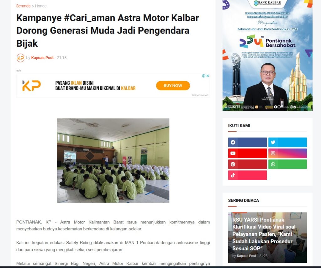 Kampanye #Cari_aman Astra Motor Kalbar Dorong Generasi Muda Jadi Pengendara Bijak by Muhammad Arif 27 Oktober 2025 in Silahkan kunjungi https://www.kapuaspost.web.id/2025/10/kampanye-cariaman-astra-motor-kalbar.html. Tags: astra Astra Motor kalbar Astra Motor Pontianak astramotor honda kalbar pontianak sepeda motor You Might Like Regional Public Launching New ADV160 The SUV Pride Grand Launching New PCX 160 Truly Exceptional! Tetap hati-hati ya bro sist berkendara saat hujan.