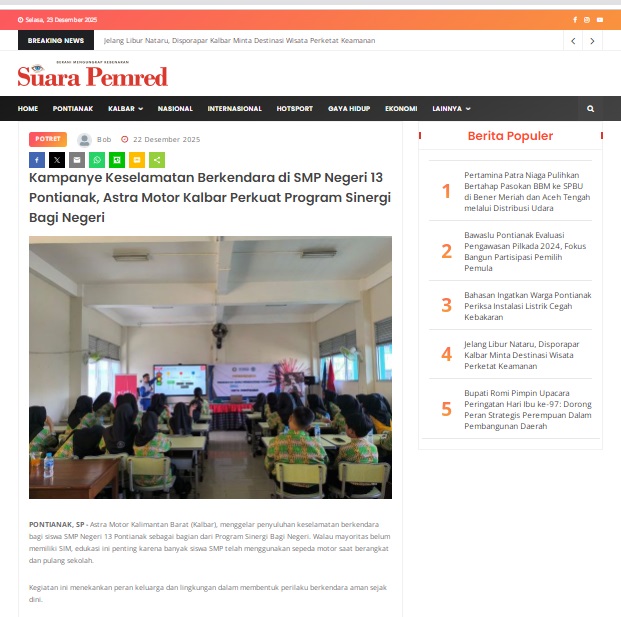 Kampanye Keselamatan Berkendara di SMP Negeri 13 Pontianak, Astra Motor Kalbar Perkuat Program Sinergi Bagi Negeri by masmul 22 Desember 2025 in Silahkan kunjungi https://www.suarapemredkalbar.com/read/potret/22122025/kampanye-keselamatan-berkendara-di-smp-negeri-13-pontianak-astra-motor-kalbar-perkuat-program-sinergi-bagi-negeri. You Might Like Regional Public Launching New ADV160 The SUV Pride Grand Launching New PCX 160 Truly Exceptional! Tetap hati-hati ya bro sist berkendara saat hujan.