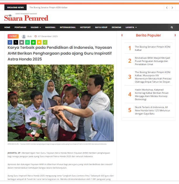 Karya Terbaik pada Pendidikan di Indonesia, Yayasan AHM Berikan Penghargaan pada ajang Guru Inspiratif Astra Honda 2025 by masmul 7 Desember 2025 in Silahkan kunjungi https://www.suarapemredkalbar.com/read/potret/07122025/karya-terbaik-pada-pendidikan-di-indonesia-yayasan-ahm-berikan-penghargaan-pada-ajang-guru-inspiratif-astra-honda-2025. You Might Like Regional Public Launching New ADV160 The SUV Pride Grand Launching New PCX 160 Truly Exceptional! Tetap hati-hati ya bro sist berkendara saat hujan.