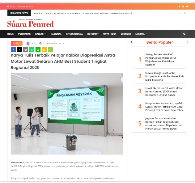 Karya Tulis Terbaik Pelajar Kalbar Diapresiasi Astra Motor Lewat Gelaran AHM Best Student Tingkat Regional 2025 by masmul 11 November 2025 in Silahkan kunjungi https://www.suarapemredkalbar.com/read/potret/11112025/karya-tulis-terbaik-pelajar-kalbar-diapresiasi-astra-motor-lewat-gelaran-ahm-best-student-tingkat-regional-2025. You Might Like Regional Public Launching New ADV160 The SUV Pride Grand Launching New PCX 160 Truly Exceptional! Tetap hati-hati ya bro sist berkendara saat hujan.