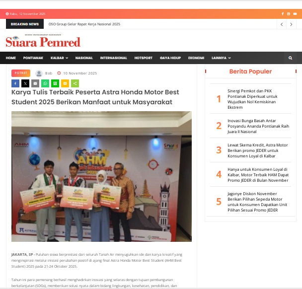 Karya Tulis Terbaik Peserta Astra Honda Motor Best Student 2025 Berikan Manfaat untuk Masyarakat by masmul 10 November 2025 in Silahkan kunjungi https://www.suarapemredkalbar.com/read/potret/10112025/karya-tulis-terbaik-peserta-astra-honda-motor-best-student-2025-berikan-manfaat-untuk-masyarakat. You Might Like Regional Public Launching New ADV160 The SUV Pride Grand Launching New PCX 160 Truly Exceptional! Tetap hati-hati ya bro sist berkendara saat hujan.