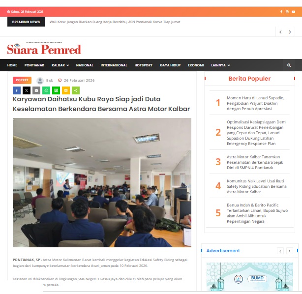 Karyawan Daihatsu Kubu Raya Siap jadi Duta Keselamatan Berkendara Bersama Astra Motor Kalbar by masmul 26 Februari 2026 in Silahkan kunjungi https://www.suarapemredkalbar.com/read/potret/26022026/karyawan-daihatsu-kubu-raya-siap-jadi-duta-keselamatan-berkendara-bersama-astra-motor-kalbar. You Might Like Regional Public Launching New ADV160 The SUV Pride Grand Launching New PCX 160 Truly Exceptional! Tetap hati-hati ya bro sist berkendara saat hujan.