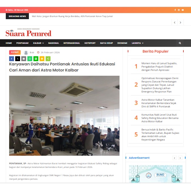 Karyawan Daihatsu Pontianak Antusias Ikuti Edukasi Cari Aman dari Astra Motor Kalbar by masmul 26 Februari 2026 in Silahkan kunjungi https://www.suarapemredkalbar.com/read/potret/26022026/karyawan-daihatsu-pontianak-antusias-ikuti-edukasi-cari-aman-dari-astra-motor-kalbar. You Might Like Regional Public Launching New ADV160 The SUV Pride Grand Launching New PCX 160 Truly Exceptional! Tetap hati-hati ya bro sist berkendara saat hujan.