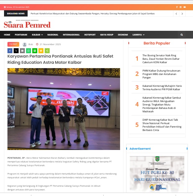 Karyawan Pertamina Pontianak Antusias Ikuti Safet Riding Education Astra Motor Kalbar by masmul 21 November 2025 in Silahkan kunjungi https://www.suarapemredkalbar.com/read/potret/21112025/karyawan-pertamina-pontianak-antusias-ikuti-safet-riding-education-astra-motor-kalbar. You Might Like Regional Public Launching New ADV160 The SUV Pride Grand Launching New PCX 160 Truly Exceptional! Tetap hati-hati ya bro sist berkendara saat hujan.