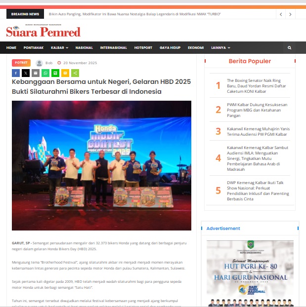 Kebanggaan Bersama untuk Negeri, Gelaran HBD 2025 Bukti Silaturahmi Bikers Terbesar di Indonesia by masmul 20 November 2025 in Silahkan kunjungi https://www.suarapemredkalbar.com/read/potret/20112025/kebanggaan-bersama-untuk-negeri-gelaran-hbd-2025-bukti-silaturahmi-bikers-terbesar-di-indonesia. You Might Like Regional Public Launching New ADV160 The SUV Pride Grand Launching New PCX 160 Truly Exceptional! Tetap hati-hati ya bro sist berkendara saat hujan.