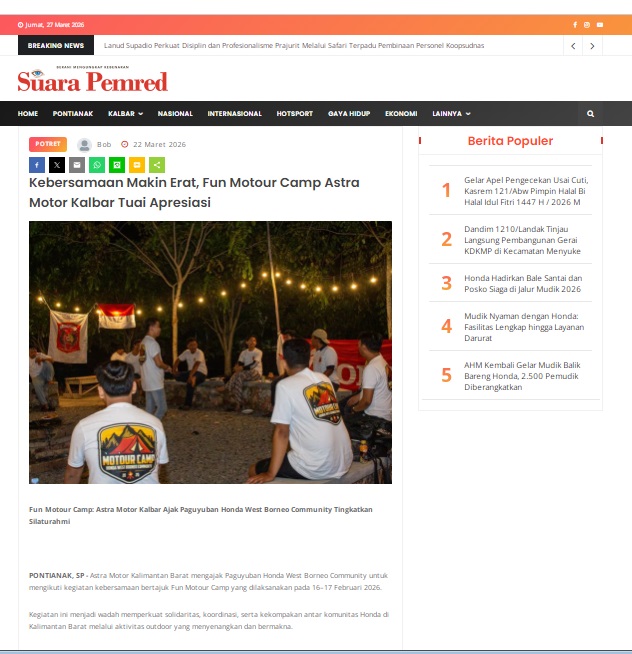 Kebersamaan Makin Erat, Fun Motour Camp Astra Motor Kalbar Tuai Apresiasi by masmul 22 Maret 2026 in Silahkan kunjungi https://www.suarapemredkalbar.com/read/potret/22032026/kebersamaan-makin-erat-fun-motour-camp-astra-motor-kalbar-tuai-apresiasi. You Might Like Regional Public Launching New ADV160 The SUV Pride Grand Launching New PCX 160 Truly Exceptional! Tetap hati-hati ya bro sist berkendara saat hujan.