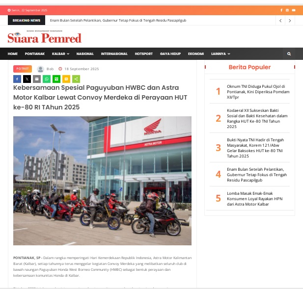 Kebersamaan Spesial Paguyuban HWBC dan Astra Motor Kalbar Lewat Convoy Merdeka di Perayaan HUT ke-80 RI TAhun 2025 by masmul 18 September 2025 in Silahkan kunjungi https://www.suarapemredkalbar.com/read/potret/18092025/kebersamaan-spesial-paguyuban-hwbc-dan-astra-motor-kalbar-lewat-convoy-merdeka-di-perayaan-hut-ke-80-ri-tahun-2025. You Might Like Regional Public Launching New ADV160 The SUV Pride Grand Launching New PCX 160 Truly Exceptional! Tetap hati-hati ya bro sist berkendara saat hujan.