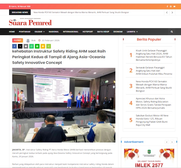 kehebatan Instruktur Safety Riding AHM saat Raih Peringkat Kedua di Tampil di Ajang Asia-Oceania Safety Innovative Concept by masmul 22 Februari 2026 in Silahkan kunjungi https://www.suarapemredkalbar.com/read/potret/22022026/kehebatan-instruktur-safety-riding-ahm-saat-raih-peringkat-kedua-di-tampil-di-ajang-asia-oceania-safety-innovative-concept. You Might Like Regional Public Launching New ADV160 The SUV Pride Grand Launching New PCX 160 Truly Exceptional! Tetap hati-hati ya bro sist berkendara saat hujan.