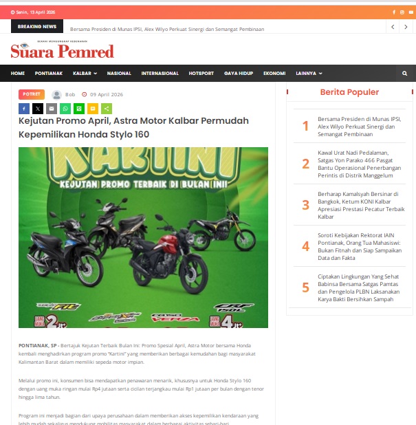 Kejutan Promo April, Astra Motor Kalbar Permudah Kepemilikan Honda Stylo 160 by masmul 9 April 2026 in Silahkan kunjungi https://www.suarapemredkalbar.com/read/potret/09042026/kejutan-promo-april-astra-motor-kalbar-permudah-kepemilikan-honda-stylo-160. You Might Like Regional Public Launching New ADV160 The SUV Pride Grand Launching New PCX 160 Truly Exceptional! Tetap hati-hati ya bro sist berkendara saat hujan.