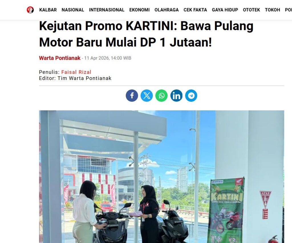 Kejutan Promo KARTINI: Bawa Pulang Motor Baru Mulai DP 1 Jutaan! by Faisal Rizal 11 April 2026 in Silahkan kunjungi https://wartapontianak.pikiran-rakyat.com/gaya-hidup/pr-11710132432/kejutan-promo-kartini-bawa-pulang-motor-baru-mulai-dp-1-jutaan. You Might Like Regional Public Launching New ADV160 The SUV Pride Grand Launching New PCX 160 Truly Exceptional! Tetap hati-hati ya bro sist berkendara saat hujan.