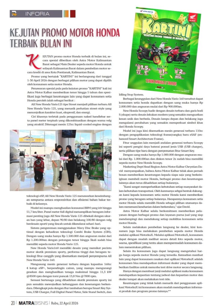 KEJUTAN PROMO MOTOR HONDA TERBAIK BULAN INI by Sri Yuliantiningsih 22 April 2026 in Silahkan buka . You Might Like Regional Public Launching New ADV160 The SUV Pride Grand Launching New PCX 160 Truly Exceptional! Tetap hati-hati ya bro sist berkendara saat hujan.
