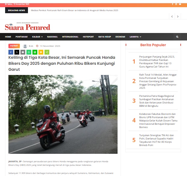 Keliling di Tiga Kota Besar, Ini Semarak Puncak Honda Bikers Day 2025 dengan Puluhan Ribu Bikers Kunjungi Garut by masmul 13 November 2025 in Silahkan kunjungi https://www.suarapemredkalbar.com/read/potret/13112025/keliling-di-tiga-kota-besar-ini-semarak-puncak-honda-bikers-day-2025-dengan-puluhan-ribu-bikers-kunjungi-garut. You Might Like Regional Public Launching New ADV160 The SUV Pride Grand Launching New PCX 160 Truly Exceptional! Tetap hati-hati ya bro sist berkendara saat hujan.