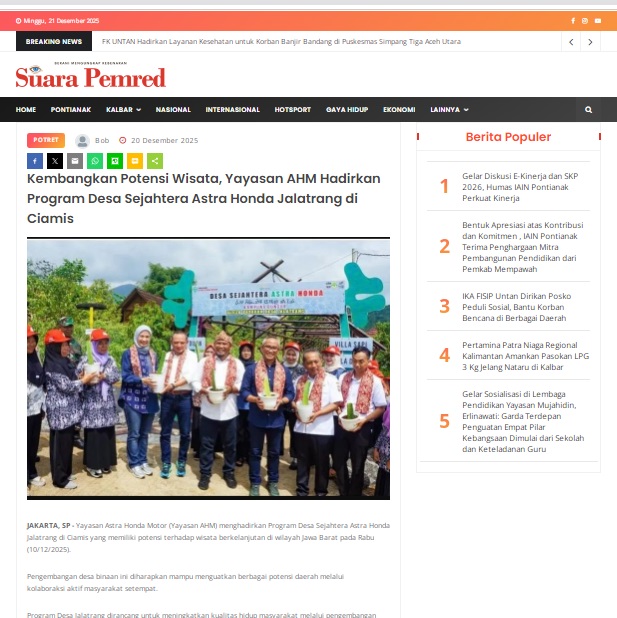 Kembangkan Potensi Wisata, Yayasan AHM Hadirkan Program Desa Sejahtera Astra Honda Jalatrang di Ciamis by masmul 20 Desember 2025 in Silahkan kunjungi https://www.suarapemredkalbar.com/read/potret/20122025/kembangkan-potensi-wisata-yayasan-ahm-hadirkan-program-desa-sejahtera-astra-honda-jalatrang-di-ciamis. You Might Like Regional Public Launching New ADV160 The SUV Pride Grand Launching New PCX 160 Truly Exceptional! Tetap hati-hati ya bro sist berkendara saat hujan.